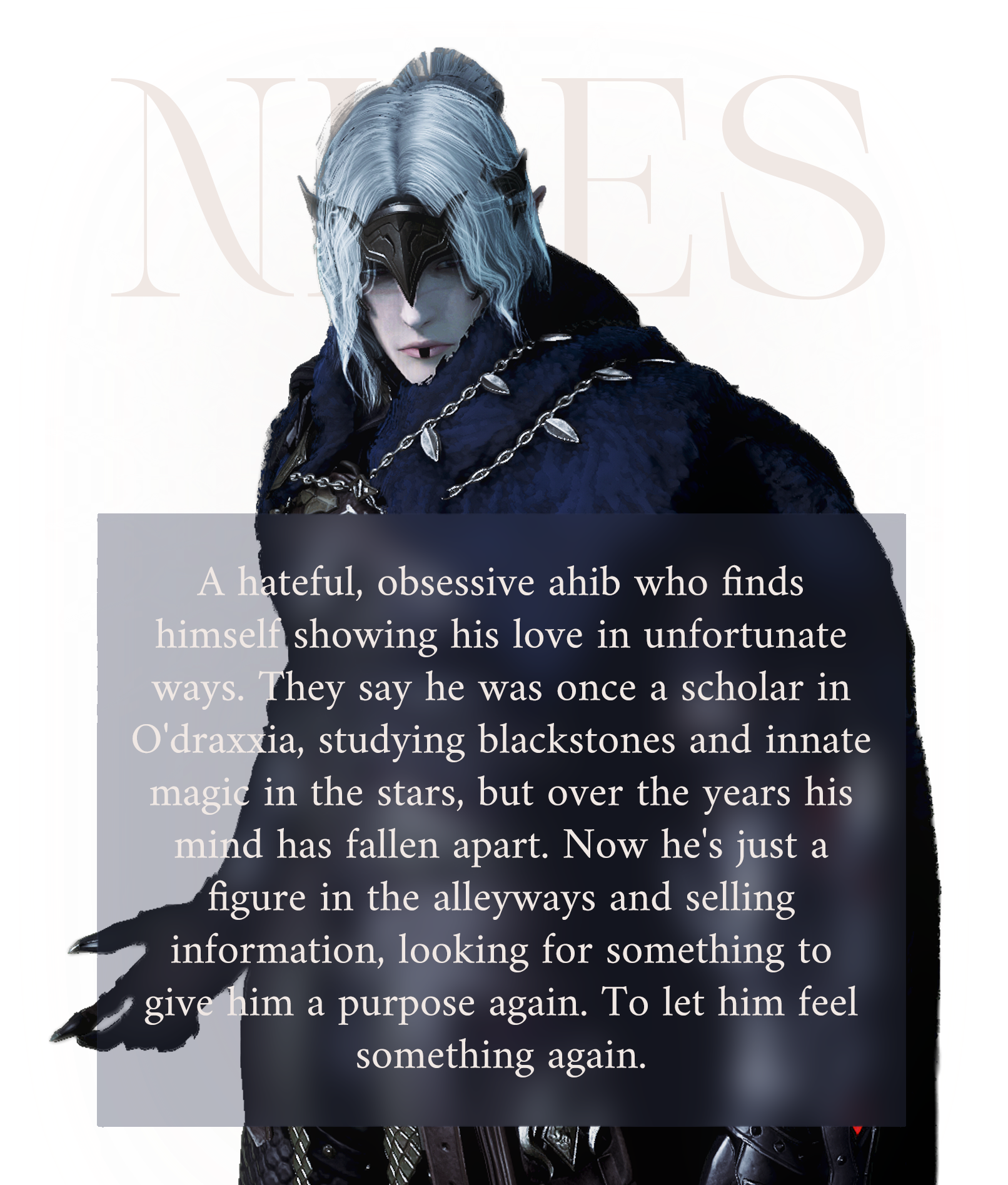 I primarily prefer rp that contains themes such as grimdark, intrigue, moral ambiguity, and ultimately the difficulty of existence. I am however open to romance rp, but my goal isn't inherently erp. I'm story-first, above all, and can absolutely appreciate platonic rp relationships.